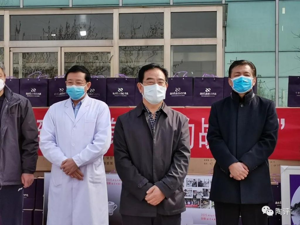出席今天捐赠仪式的领导和嘉宾有:唐山市市政协党组副书记、正厅级巡视员:杨永山;唐山市政协副主席、唐山工人医院院长、市抗击新冠肺炎救治指挥中心副主任:胡万宁;唐山市原人大副主任、唐山市老科协会长:魏文娜;中国陶瓷工业协会副秘书长:樊瑞新;唐山市委宣传部调研员:刘育新;唐山市卫健委主任:徐昌盛;河北省援唐专家组组长田英平教授、吕建波教授;唐山市传染病院党委书记:赵秀凤;唐山市陶瓷协会会长、中陶实业有限公司董事长:夏剑石;唐山亚洲时代陶瓷有限公司总经理、中国陶瓷艺术大师:李剑平;唐山隆昌瓷业有限公司总经理:陈树生;中国书法家:陈启壮、杨玉剑、以及部分医护人员、陶瓷企业代表和新闻媒体朋友。