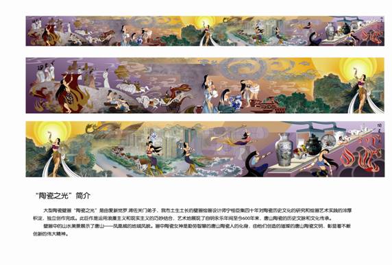 本人通过对中国古代与现代的陶瓷的深刻解读,创作了壁画《陶瓷之光》作品通过对唐山数百年陶瓷发展与唐山现代文明发展与工业发展有机结合,浪漫与现实结合,土与火形成的艺术相结合,形成了陶瓷与这座现代工业城市的融合,作品采用高温釉中工艺,色彩欢乐中充满着热情,热情中绿色充满了生命,生命传承着这座凤凰城的历史文化,诉说着她的变迁,作品虽用高温釉中彩工艺,难度高在艺术手段上采用手绘、喷绘等陶瓷艺术手段,使之作品更具有新的时代特色。