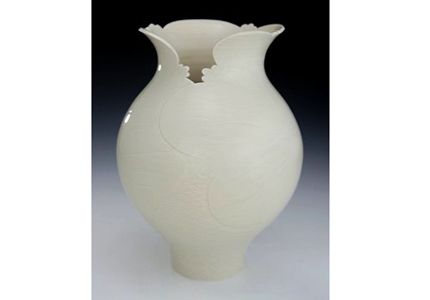 创新作品。体态丰腴,弧线流畅,通体施定瓷白釉,造型取宋代杨万里“接天莲叶无穷碧”之诗意。瓶体被一硕大的荷叶包裹,如少女的披肩,优雅大方。下饰澹澹波纹,似缕缕春风,整件作品呈现出明丽高雅之气象。原作获第43届国际陶艺大会金奖。