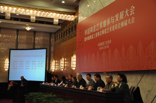 2013年12月10日,由中国陶瓷工业协会主办的“中国陶瓷艺术继承与发展大会暨中国陶瓷工业协会陶瓷艺术委员会换届大会”在北京隆重召开。十届全国人大副委员长何鲁丽、中国轻工业联合会会长步正发、第十二届全国政协常委韩美林先生、中国轻工业联合会名誉会长、中国陶瓷工业协会名誉理事长杨志海、中国传记文学学会主席万伯翱、民政部社团管理局局长孙伟林、中国轻工业联合会副会长、中国陶瓷工业协会理事长杜同和、国资委行业管理办公室主任张涛、中国轻工业联合会副会长、景德镇陶瓷学院名誉院长秦锡麟、中国古陶瓷学会会长王莉英出席本次会议。来自全国各产区政府代表、各省市陶瓷协会会长、著名艺术院校陶瓷专业教授、各产区陶瓷艺术大师及陶艺家代表等400余人参加会议。