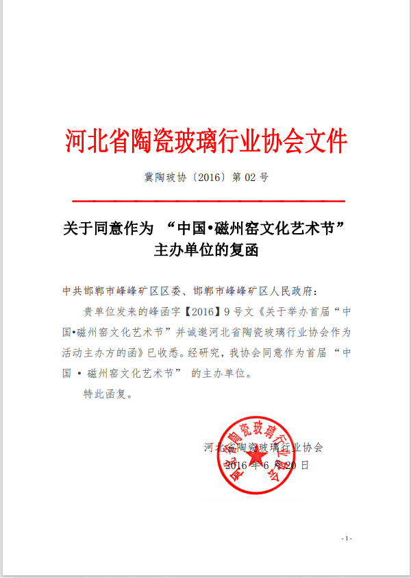 首页 协会公告 关于关于同意作为 “中国•磁州窑文化艺术节”主办单位的复函
