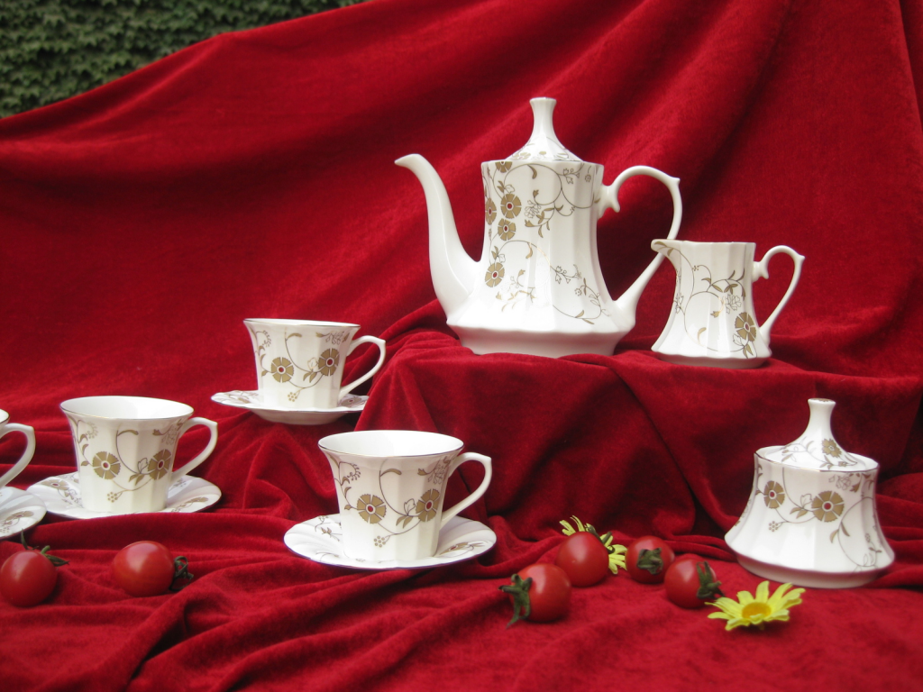 创意与工艺:根据骨质瓷独特的工艺,优雅的瓷质,联想到宝石的华丽、璀璨圣洁。在创作过程中在采用流线的基础上,不失挺拔,壶体高挑不失稳重。壶、盖、糖、奶、杯碟采用通身内弧浮雕,使器型更加生动严谨,增强了整体感,加上缠枝金花纸装饰,使其更加优雅,在不同的光源照射下,像宝石一样光彩照人。