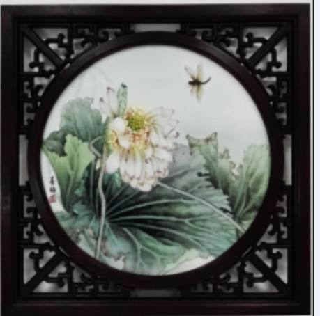 创意与工艺:采用釉上彩,工笔与写意的结合。荷花优雅的姿态和蜻蜓仿佛在诉说着一个故事,蜻蜓穿梭,荷花娇语,蕴含着无限的生机和活力。这是一副工笔兼写意的画作,即有工笔的细致,又有写意的大气,画面透着灵动,任人去遐想。