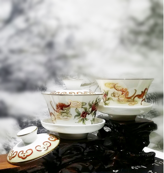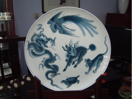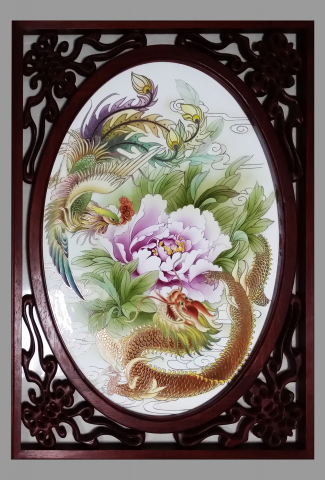 创意与工艺:是一副吉祥如意,喜庆祥瑞的图案,具有典型的中国传统风格。其工艺彩用传统雕金加彩装饰手法和传统的龙凤相结合,雕金加彩出来的画面有凹凸,明暗的对比,这样的装饰具有高雅富丽,雍容庄严的艺术效果。2014年《龙凤呈祥》在参加河北省陶瓷艺术与设计创新评比中荣获陶瓷银奖。