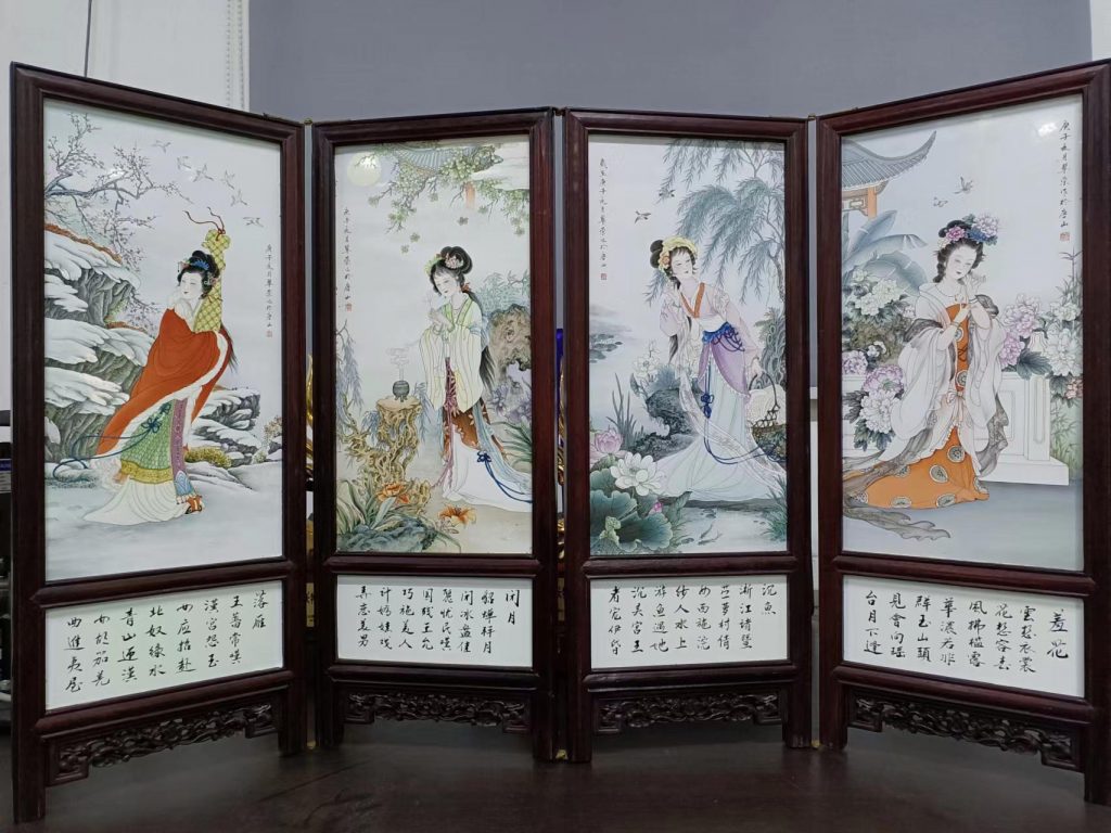 创意与工艺:创作设计的小屏风《四大美女》是受我老师李景海的代表作《四大美女》瓷板画的启发。以我40余年陶瓷绘画经验和对仕女人物画的情有独钟,尤其喜欢这四大美女。她们的故事千年不衰。我就想,也把她们的美用画笔在瓷板上表现出来,应该也是一件很有价值的作品,因此设计欲望由然而生。