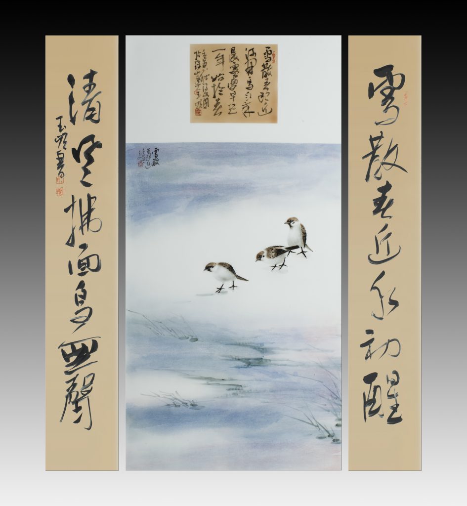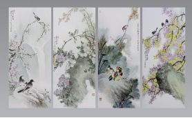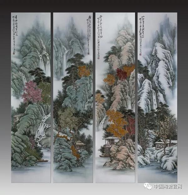 创意与工艺:这幅陶瓷大型屏风的创作,首先在材质上选用了目前唐山骨瓷最大的双面釉瓷板,山水采用了工细的唐宋传统画风并结合现代陶瓷理念,在画面处理上让人赏心悦目,山石远近拉开,溪水飞流,润气飘溢,让人身临其境。在每一个(春、夏、秋、冬)画面的处理上,在溪石、林树、草房、木桥等点景的处理上笔笔精到,并点一两人物于其上,情趣盎然,带着一种笔墨的幽雅和对传统山水留恋回眸,本幅作品格调高雅,凝重而不失轻灵。另一面花鸟四季以艳丽的色彩区分四季,视觉上比较明快,并以工笔细致勾勒禽鸟辅以写意的背景,粗细对比,使整幅画面既有写意的淋漓笔意又不失花鸟画独有的细腻。