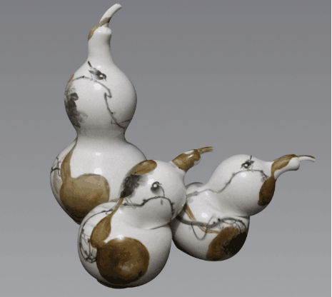 创意与工艺:这组《福禄三千》葫芦瓶,以组画的形式出现,是作者对陶瓷语言的理解和心中的陶瓷艺术的阐述。在取材上作者选用了两个自然烧歪的葫芦和一个完整的大葫芦做为题材,以独特的艺术视觉进行创作,在器型和画面的结合上动了许多心思,在器型上设计画面的时候采用了大量的留白的理念,突出骨质瓷瓷质的美感。画面运用笔墨和工细的山雀相合,并结合线条的自然美感组合成画,清新自然,极具现代陶瓷美感,在传统中透出一股创新的思路。在器型与绘画的结合中赋予陶瓷的自然美,设计美和制作美。