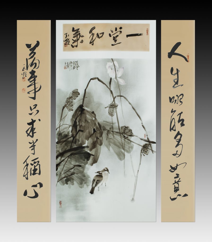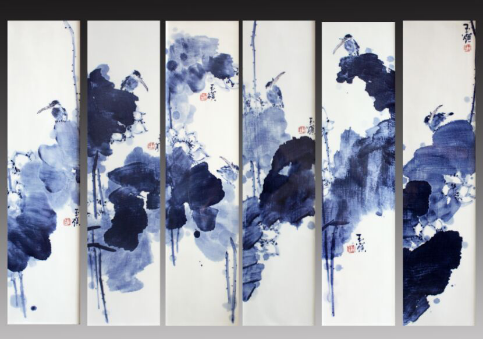 创意与工艺:此作品为釉下青花六联屏,采用国画大写意的技法,构图合理,颜色深沉,层次丰富。泼墨的自然流动,鸟儿的灵动,与不规则的荷花情境相呼应,传递了大意境中的“一团和气”。