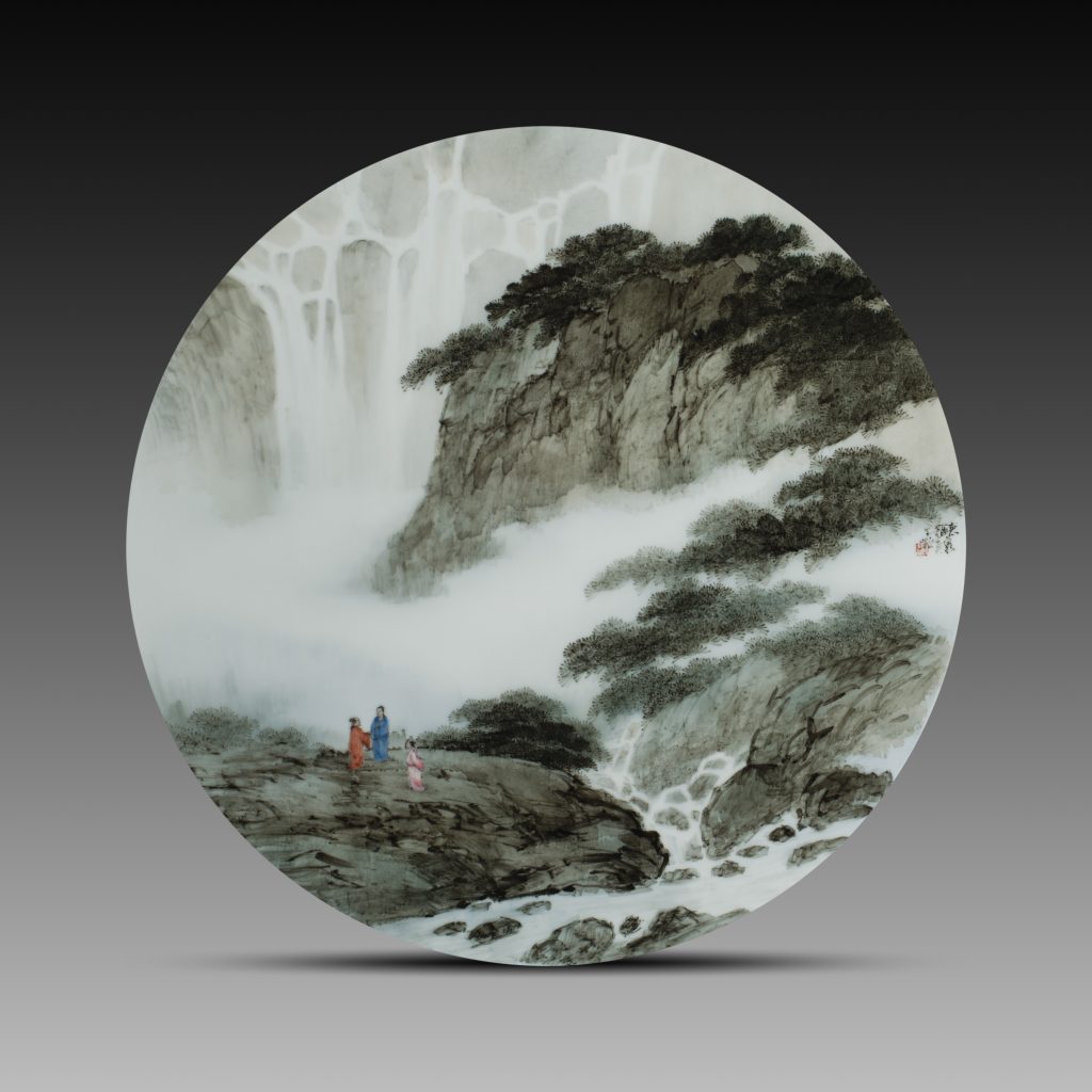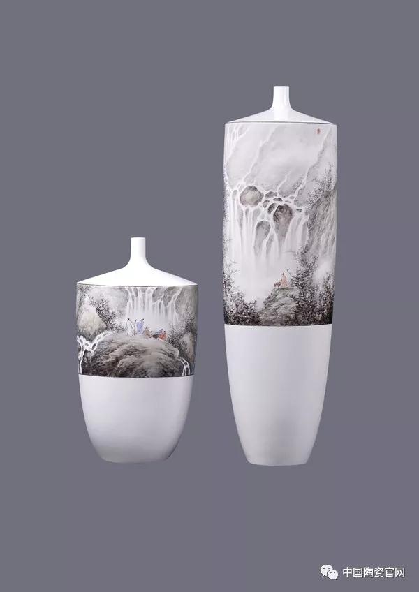 创意与工艺:此作品运用传统山水画风格,配以书法来装饰瓷器。给人感觉就是一副清新淡雅的水墨画。画面表现青山碧水,树木郁郁葱葱,远处飞瀑。几位老者或坐或立,听琴观瀑,一派身闲如画的境界,使画面彰显出幽雅的格调,并极具浓郁的水墨效果,画风清淡含蓄。