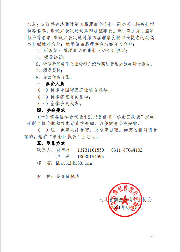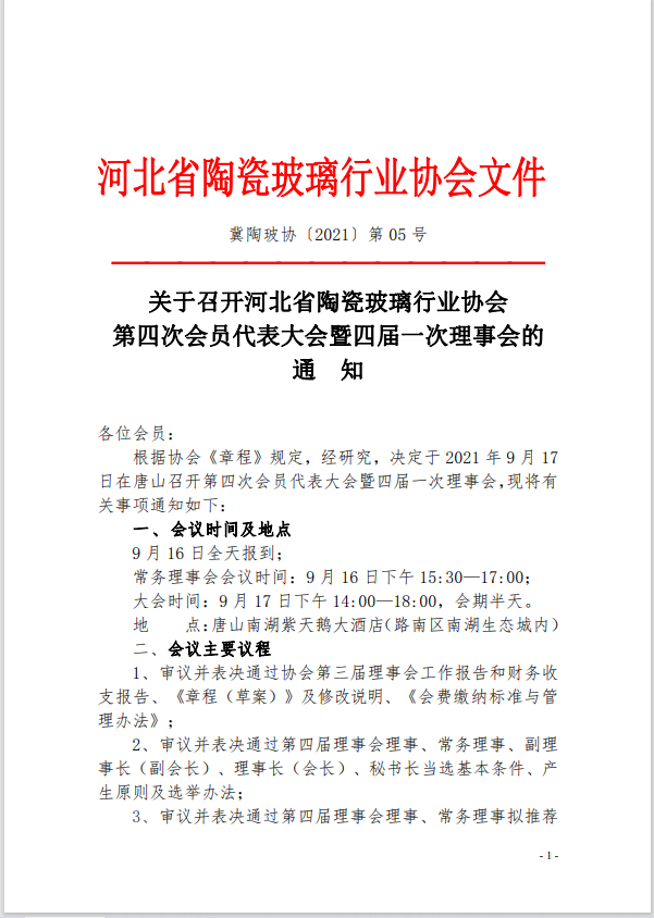 关于召开河北省陶瓷玻璃行业协会第四次会员代表大会暨四届一次理事会的通知