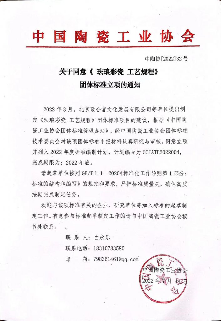 关于同意《珐琅彩瓷 工艺规程》团体标准立项的通知